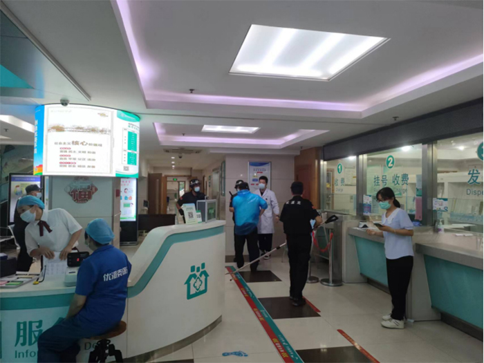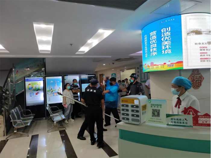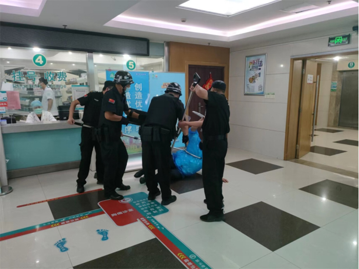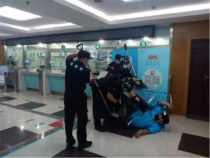 演練現(xiàn)場模擬一暴恐分子持刀強(qiáng)行闖崗,執(zhí)勤保安迅速報(bào)保衛(wèi)科及分管領(lǐng)導(dǎo),并撥打110報(bào)警電話,同時(shí)疏散就醫(yī)群眾和工作人員。